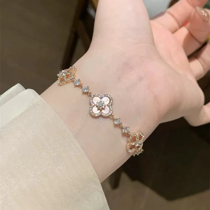 Four-Leaf Clover Crystal Bracelet – Pink Mother of Pearl, Rose Gold, Lucky Charm Jewelry